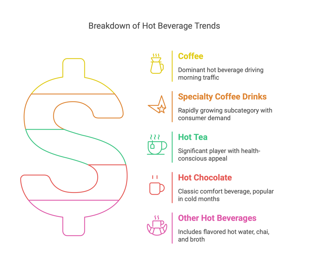 - This is consistently the dominant hot beverage. From basic brewed coffee to specialty cappuccinos and lattes, it’s a huge driver of morning traffic.