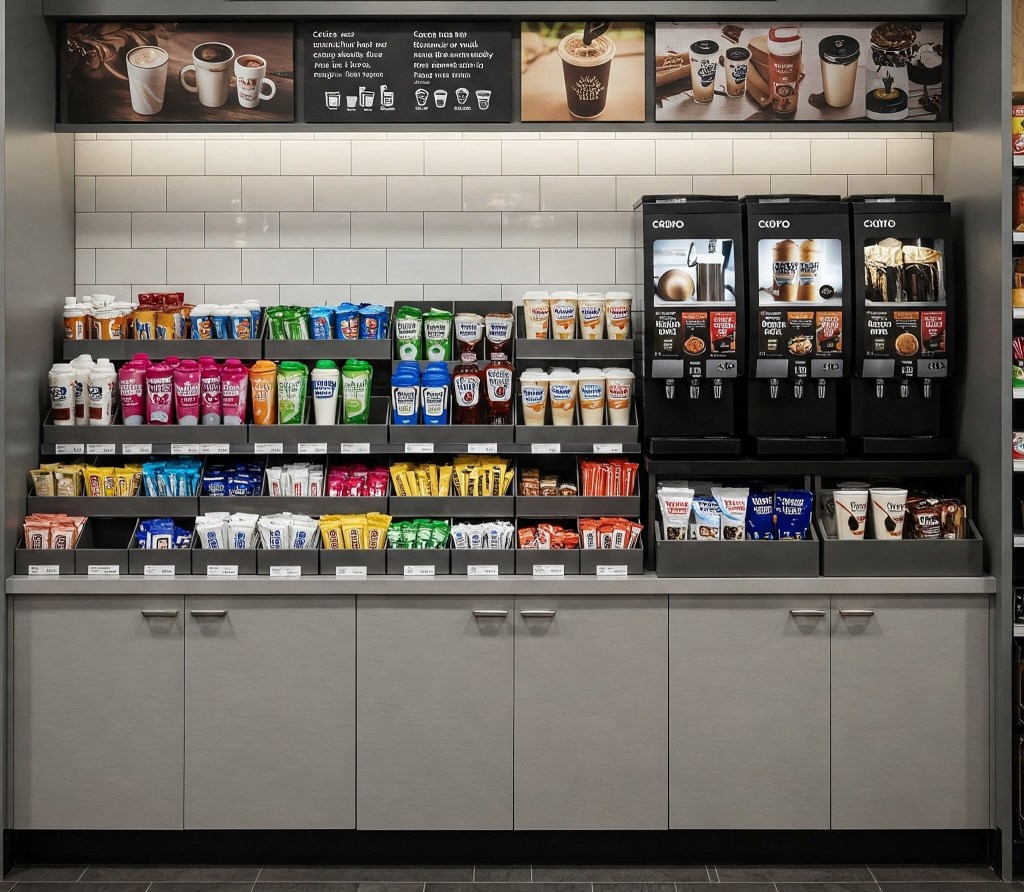 - Let’s face it, aesthetics matter. A dated, drab condiment area doesn’t exactly scream “quality brew.” A modern, visually appealing station elevates the entire coffee experience. Think clean lines, good lighting, and maybe even incorporating your store’s branding elements. Using quality materials (even durable, attractive plastics) suggests you invest in your offerings. This visual upgrade aligns with customer expectations of quality and can make your coffee program feel more premium.