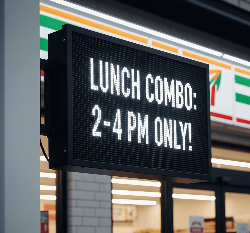 - Strategically use dynamic digital signage: Don’t just put up static ads. Use outdoor displays to direct traffic, window displays for daypart-specific promotions, and in-store screens to highlight food offerings, loyalty points, and even your store’s brand story. Remember, technology should align with your brand, not just advertise vendor products.