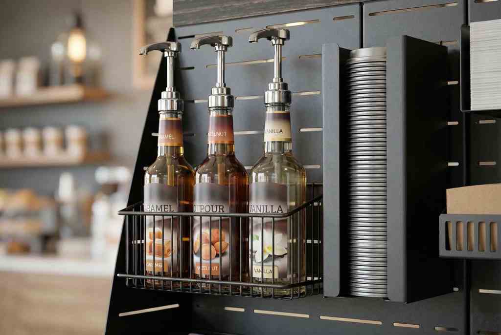 - Flavored syrup bottles (stable, secure, and visually appealing display)