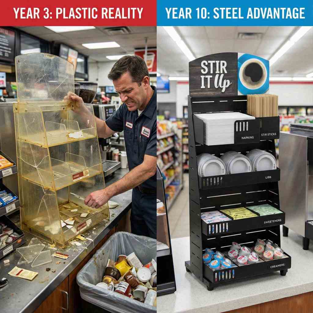 Even a marginal reduction, such as saving five minutes per station per shift, will accumulate quickly. Over a decade, this can add up across a multi-unit store fleet. It yields substantial, measurable reductions in operational labor expenditure. The TCO disparity is driven by this simple fact: plastic forces high labor and frequent replacement; steel minimizes both.