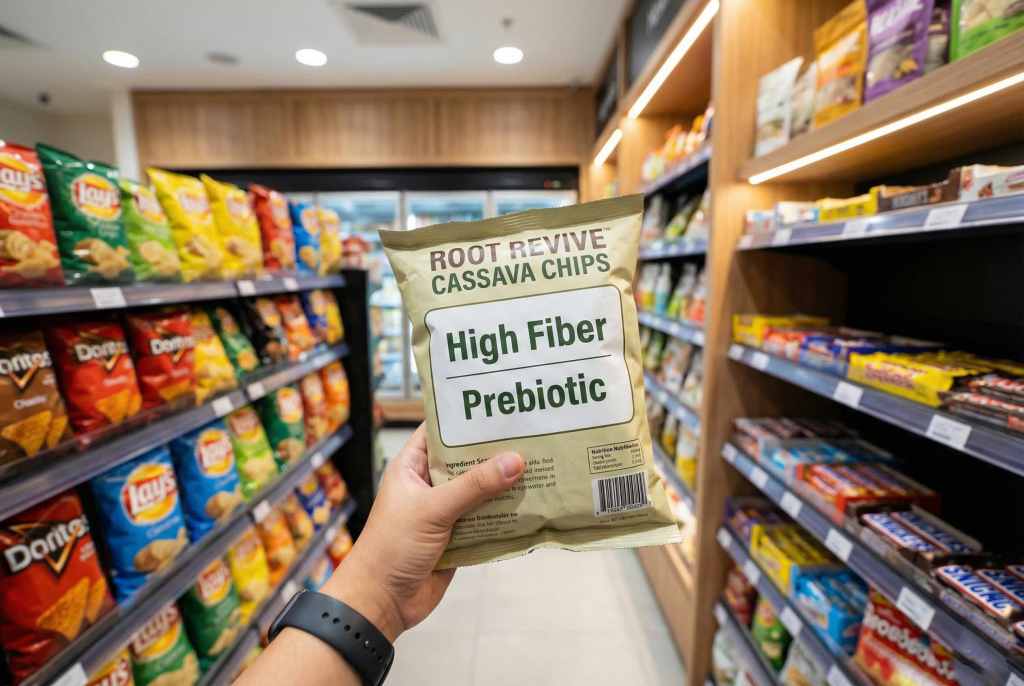 - Root Vegetables: Look for chips and snacks made from Cassava or Konjac. These root vegetables offer high viscosity and resistant starch, which promotes fullness and regularity.